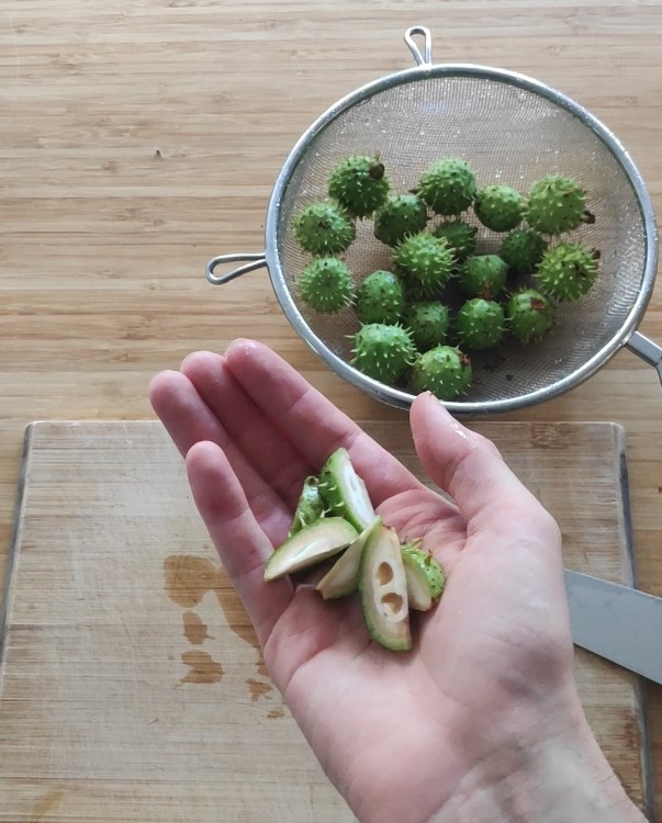 Surowcem zielarskim nas interesuje w lipcu są niedojrzałe owoce kasztanowca – Hippocastani fructus immaturus. Zbieramy je kiedy już są w miarę duże, ale wciąż niedojrzałe. W tym okresie posiadają one bowiem pewne unikalne i bardzo przydatne właściwości. Zawarte w nich związki m.in. escyna, eskulina, flawonoidy – wykazują działanie silnie wspierające tkanki i naczynia krwionośne. Zacytuję tutaj fragment artykułu dra Różańskiego – “Wyciągi z niedojrzałych owoców i dojrzałych nasion służą do leczenia obrzęków pooperacyjnych, pourazowych, zaburzeń krążenia żylnego kończyn i mózgu, żylaków kończyn i odbytu (hemoroidów). Podawane są w przypadku udaru, obrzęku mózgu, w stanach zapalnych żył, przy zakrzepach, zawałach, w profilaktyce zakrzepicy. Wyciągi z owoców i nasion zmniejszają przepuszczalność ścian naczyń, przywracają elastyczność naczyniom krwionośnym, poprawiają krążenie obwodowe, mózgowe i wieńcowe. Usprawniają krążenie krwi w skórze. Przyśpieszają resorpcję płynów surowiczych w miejscu obrzęku. Hamują stan zapalny oraz odczyn alergiczny.”